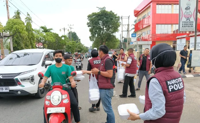 Bungo – Semangat berbagi di bulan suci Ramadhan kembali ditunjukkan jajaran Polres Bungo. Melalui Satuan Reserse Narkoba, aksi sosial pembagian takjil digelar untuk masyarakat yang membutuhkan, Selasa (3/3/2026) sore.